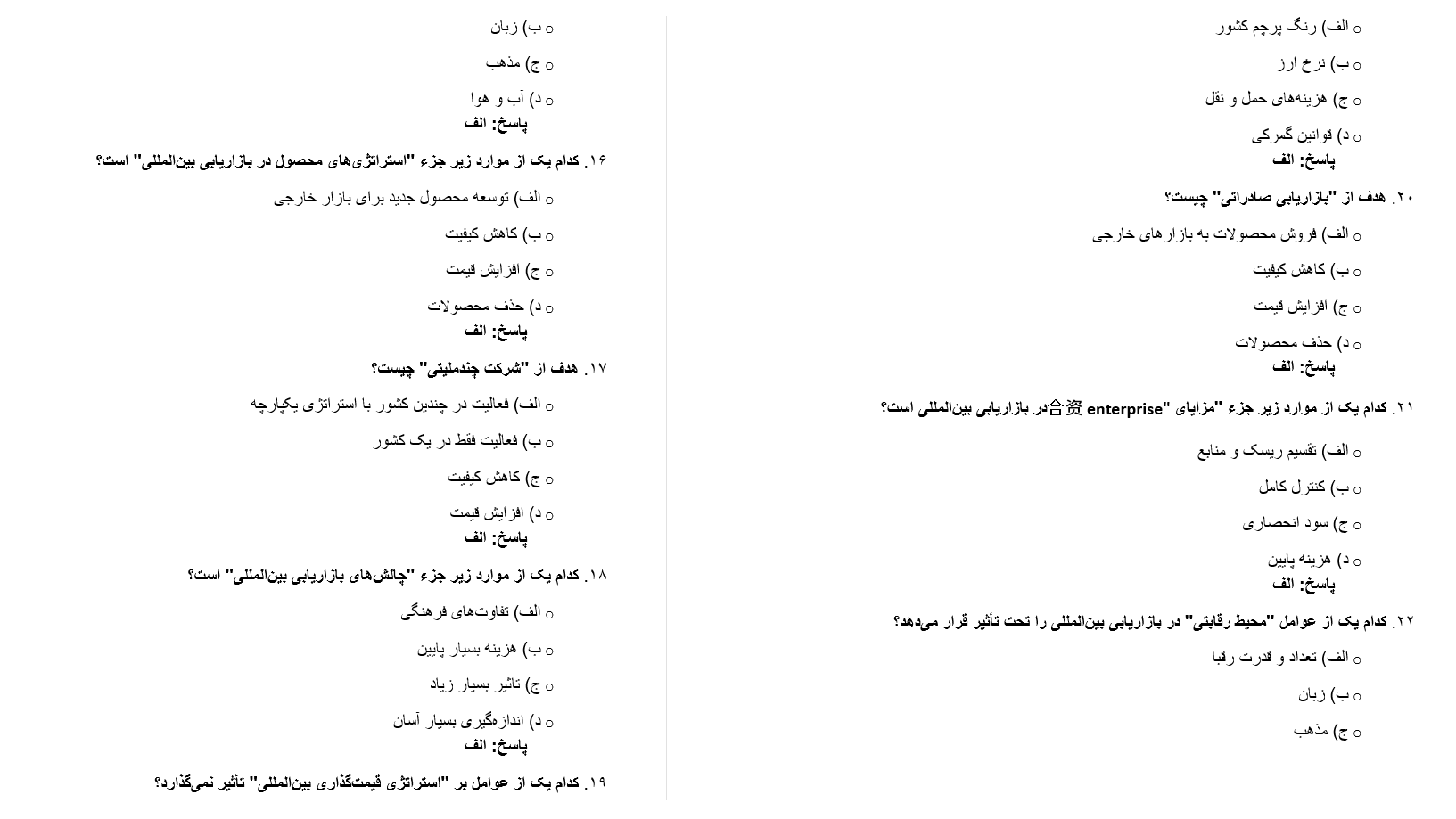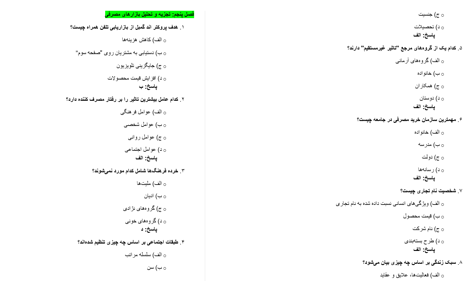 این سوالات برای دروس مدیریت بازاریابی در مقاطع مختلف کارشناسی و کارشناسی ارشد قابل استفاده است: